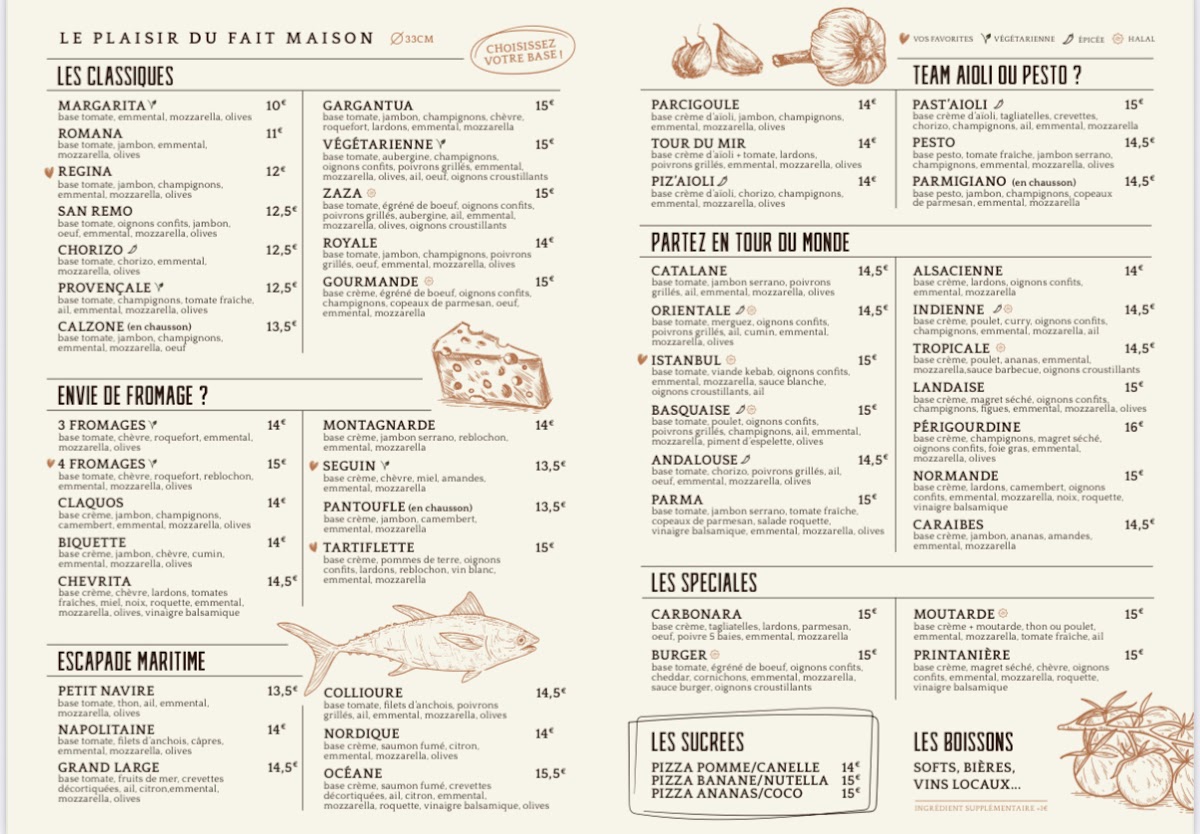 The menu boasts a tempting selection divided into two main categories: Les pizzas de la mer and Les pizzas du monde. Each pizza is crafted with high-quality ingredients and baked to perfection in a traditional wood-fired oven, creating crusts that are both crispy and chewy. Delight in the fresh Petit Navire featuring juicy tuna, garlic, and olives, or explore the flavors of the Collioure, where anchovies meet roasted peppers for a savory experience. Seafood lovers will adore the Grand Large, where shrimp and assorted delicacies from the sea merge in each mouthwatering slice.